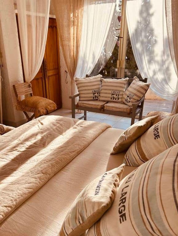 Der Schlafbereich umfasst zwei Schlafzimmer mit direktem Zugang zur Terrasse: ein Doppelzimmer und ein Dreibettzimmer. Ein Badezimmer und zwei WCs vervollständigen das Ensemble.